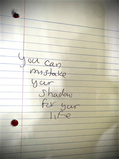 Channeling, Poetry You can mistake your shadow for your life. Posted by Aubrey's Arch on September 15, 2020September 15, 2020 9.15.20 Share this:Tweet Share on WhatsApp (Opens in new window) WhatsApp Email a link to a friend (Opens in new window) Email Like Loading... Related