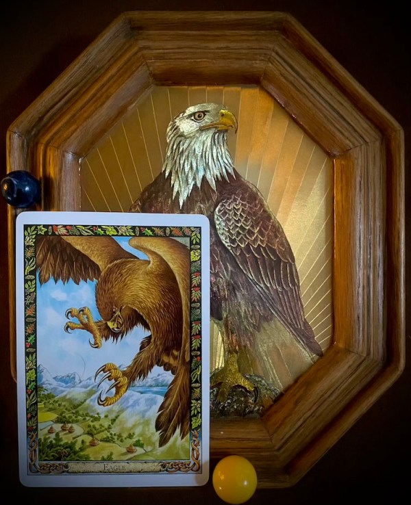 ‘Iolair [Gaelic for eagle] Intelligence-Renewal-Courage – Iolair helps you to see your life in the wider context, enabling you to make decisions and chart your goals with clarity and objectivity. The eagle is a powerful ally; it is courageous and strong, drawing its power from the sun. If you will allow the eagle to work for you, it will bring you a sense of purpose and the courage to see this through, enabling you to venture into fresh territory with confidence. It will allow you to detach yourself from everyday worries and cares, and will enable you to grasp subtle concepts. The eagle, when accepted, will also show you how to renew and rejuvenate yourself, by demonstrating the art of plunging – at just the right moment – into the lake of the heart.’