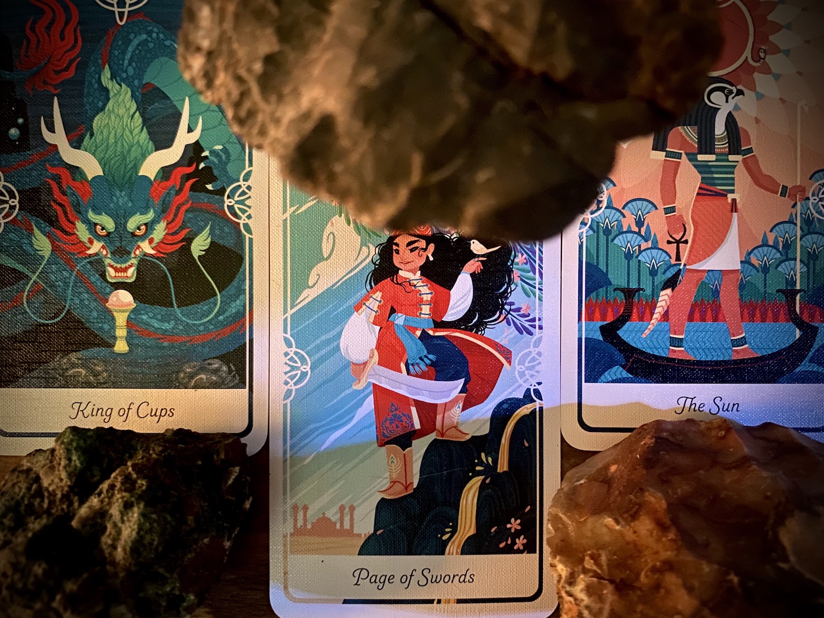 ‘THE BOY AND THE DRAGON PEARL—CHINA, Chinese Legend—The King of Cups was once a little boy but has matured into a powerful dragon. He is kind but fiercely protective of those he loves. He is connected to the deep dark waters of the subconscious. He possesses great patience and wisdom.’