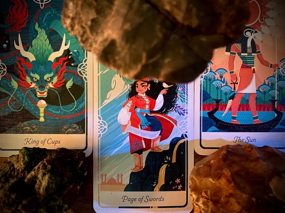 ‘PRINCESS PARIZADE—ANATOLIA, Arabic Folk Tale—The Page of Swords represents youthful intelligence. Princess Parizade uses her wit to succeed where others have failed, her optimism intact through it all. She is a harbinger of new beginnings and new ideas for herself and those around her.’